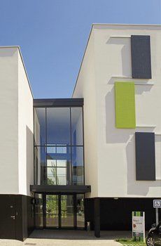 Ce projet se distingue par une alliance originale entre isolation thermique de type ETICS (surface totale : 10 000 m²), qui associe un enduit mince à un isolant polystyrène, et des façades très largement vitrées.