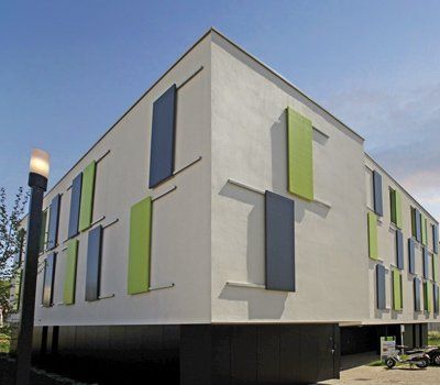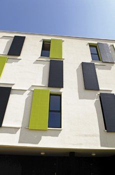 Cet ensemble de 17 logements BBC (Bâtiment Basse Consommation) se distingue par ses volumes épurés et ses façades marquées par une alternance subtile de pleins et de déliés : la façade sur rue, avec ses claires-voies en métal faisant office à la fois de protection visuelle et de brise-soleil, joue avec bonheur sur les effets de transparence.
